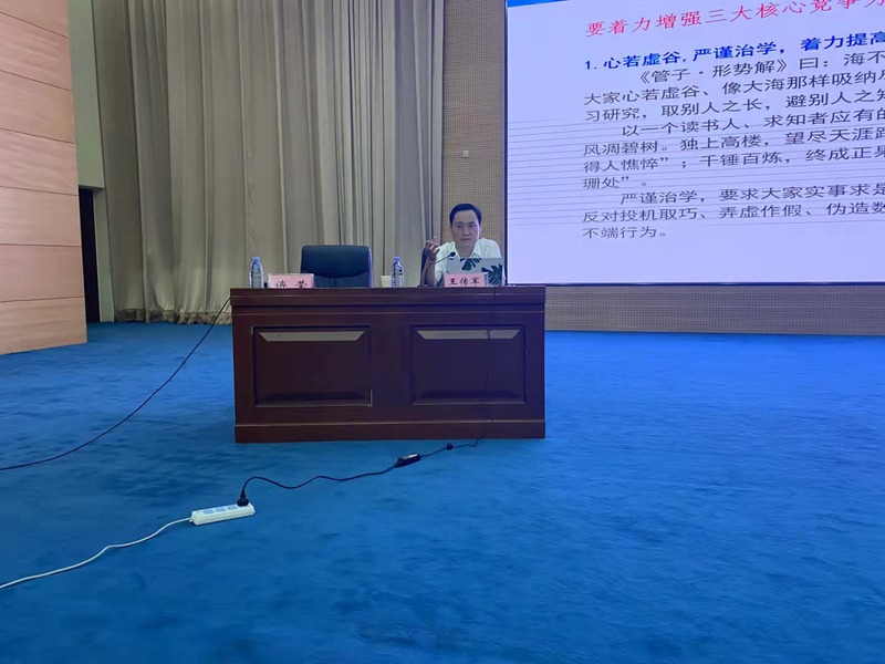 王传军以《做成功的医学生——基于济医文化背景下的成才路径》为题,为来自五湖四海的新生介绍了学校的基本情况、核心文化理念、师资力量、教学条件、专业发展现状等,通过讲述济医附院抗疫事迹、小李红珊等多个“爱”的故事,诠释了“大爱济医”的深刻内涵。鼓励大家永葆医者情怀,不辱初心使命,为人类生命健康做出应有的贡献。