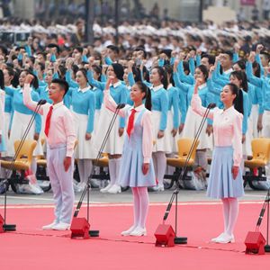 2021年7月1日上午,庆祝中国共产党成立100周年大会在北京天安门广场隆重举行。这是共青团员和少先队员代表集体致献词。新华社记者 陈晔华 摄